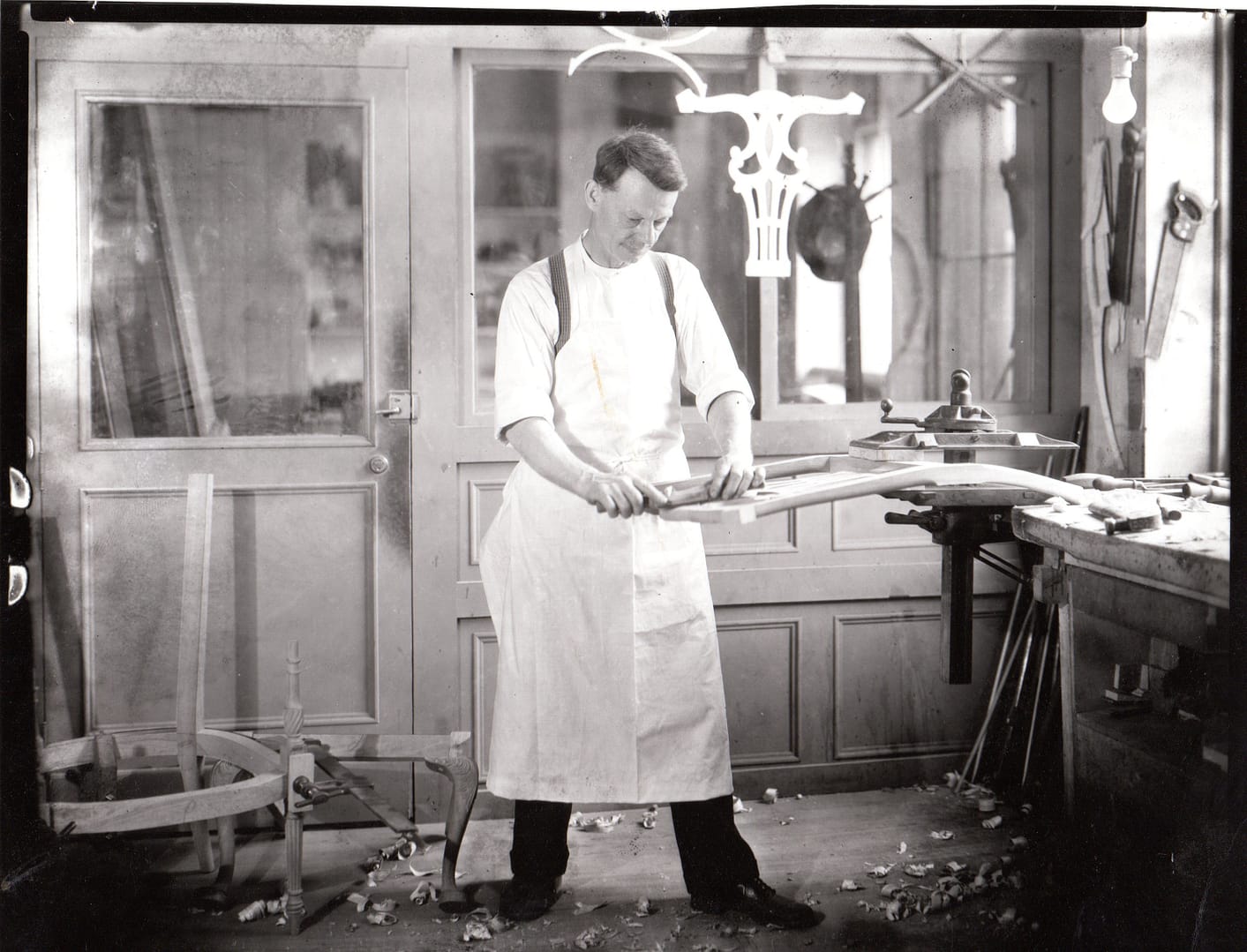Sam Carluzzi – Master Upholsterer George Sly – Master Turner Enrico Conagaris – Master Finisher Craftsman clamping a chair back together. Craftsmen clamping a whole chair together with there home made chair clamp. Craftsmen putting a drawer together.