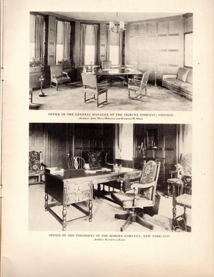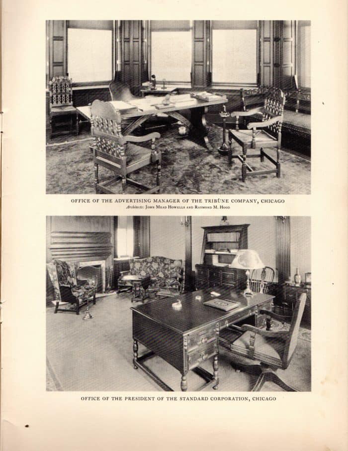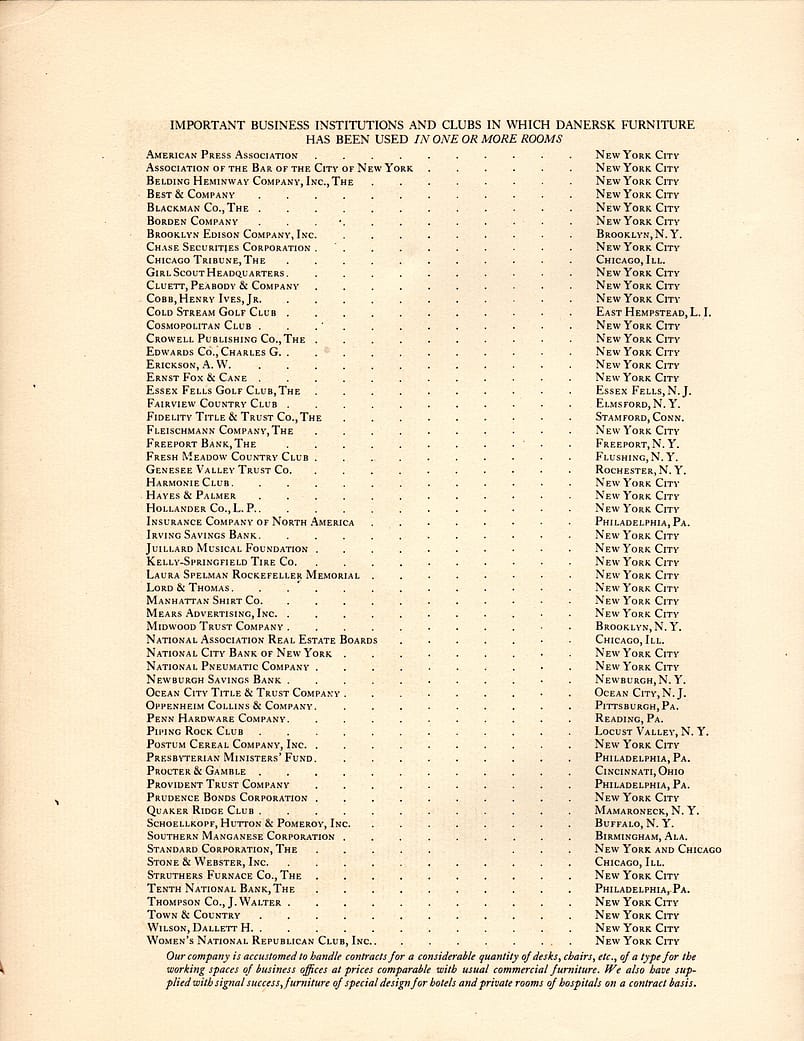 The products, sold under the brand names “Erskine-Danforth” and “Danersk” consisted of a variety of household furniture for bedrooms, diningrooms, and Livingrooms, and an assortment for executive offices. Exceptional work was undertaken for businesses and other institutions, such as banks, insurance companies, corporations, executive offices, libraries, clubs, hospitals, and educational institutions. Numbered among the company’s customers were many of the United States’ outstanding institutions.