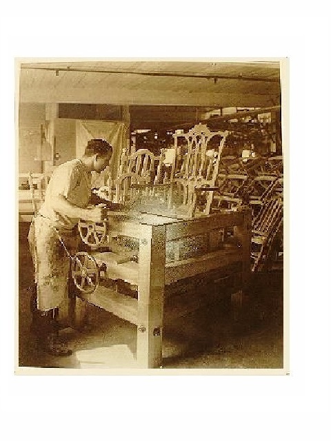 Craftsmen clamping a whole chair together with there home made chair clamp.