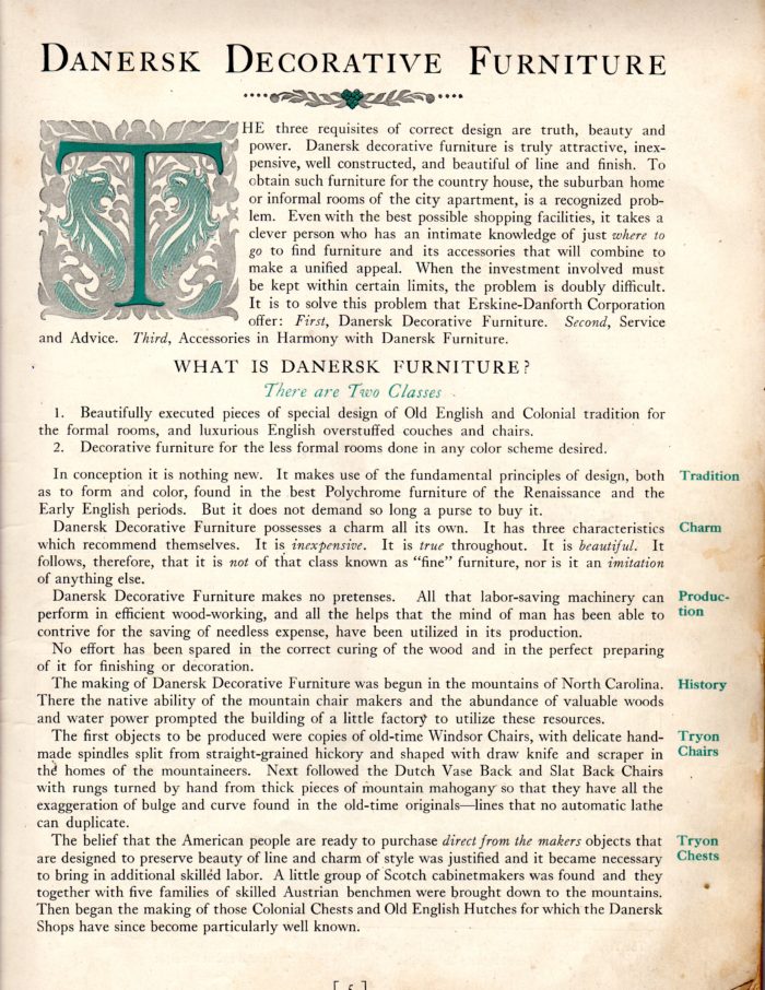 The conviction that furniture designed and made in the spirit of sincerity and of appropriateness for the American home could be produced and sold profitably and in a manner to give permanent assurance of profit, remained at all times the purpose and inspiration of the Erskine-Danforth Corporation operations.